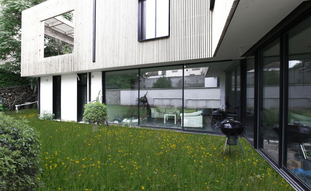 Les maison restent des maisons de ville et s’inscrivent dans un paysage mi-pavillonnaire, mi-industriel. Pour conserver cette empreinte, l‘enduit blanche est utilisé pour le soubassement. Le verre est également très présent pour utiliser au maximum la lumière naturelle et permettre un dialogue avec la nature environnante.
